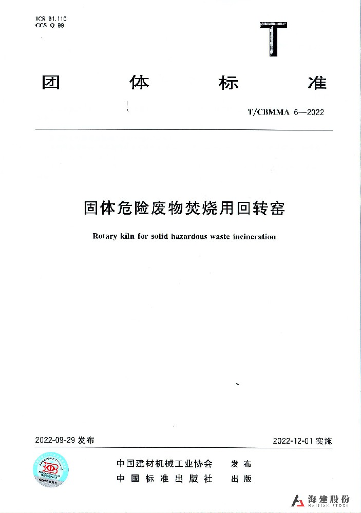 由江苏海建股份有限公司及中国建材机械工业协会牵头起草的《固体危险废物焚烧用回转窑》团体标准目前已印刷完成。此项标准内容主要涉及固废窑整机性能···